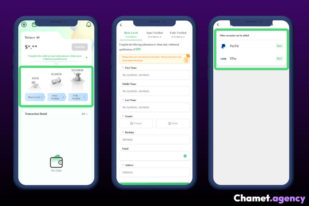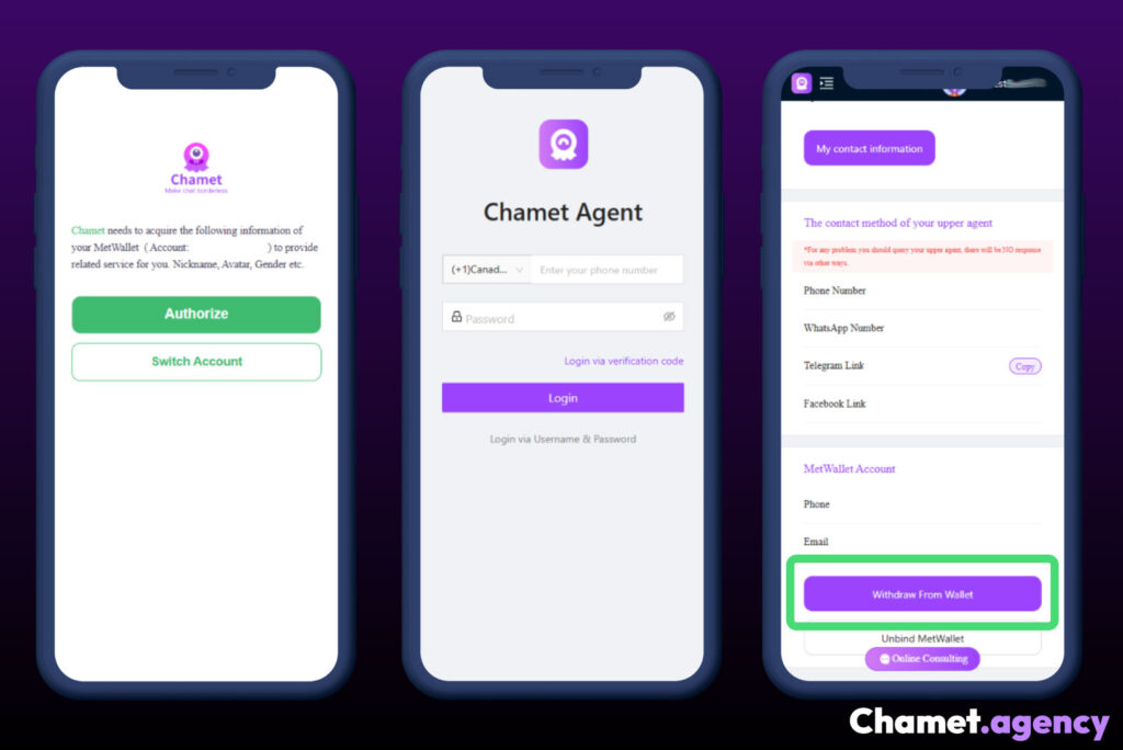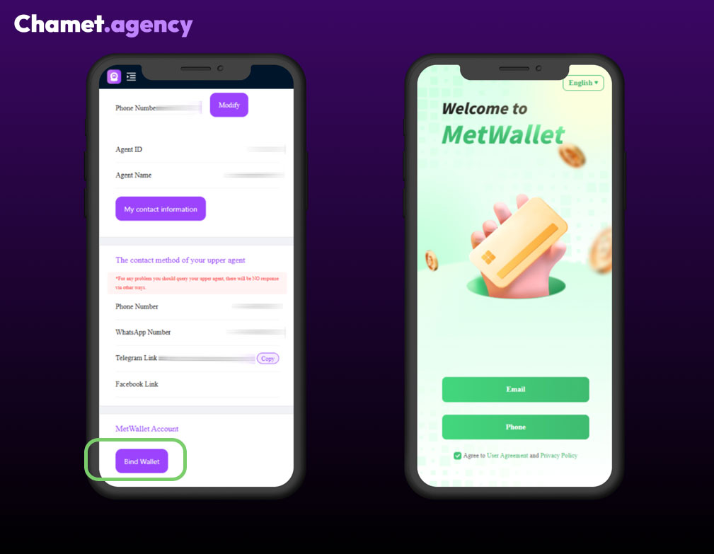 To receive commission payouts, agents must connect their account to MetWallet, which is the official withdrawal platform used by Chamet.